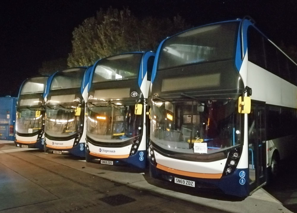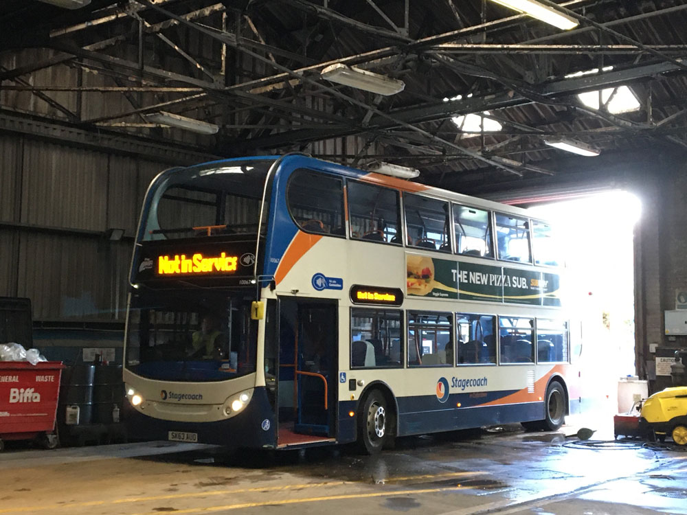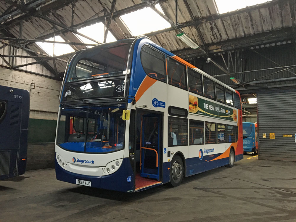least one has gained standard Stagecoach livery, 10041, KX12GKX.