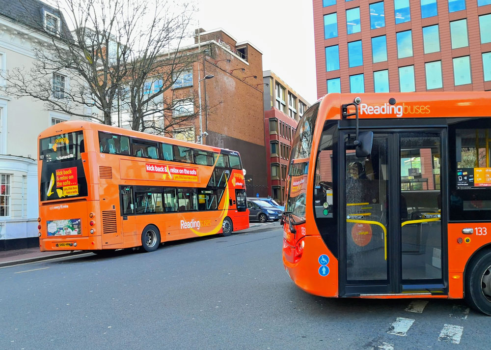 and Reading claret Enviro 400MMC 755 on route 21 to Lower