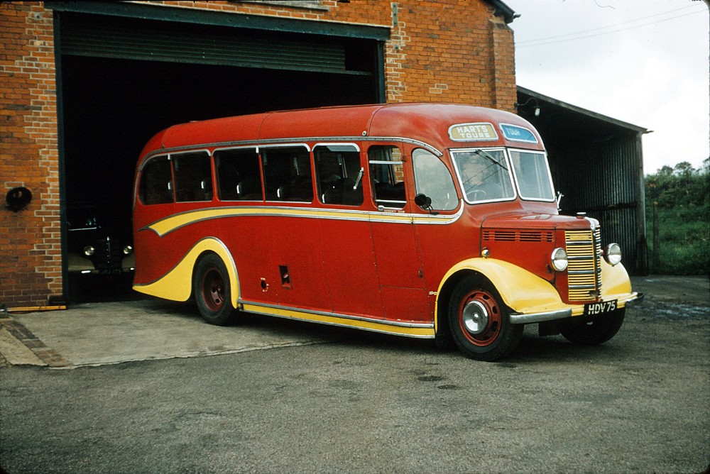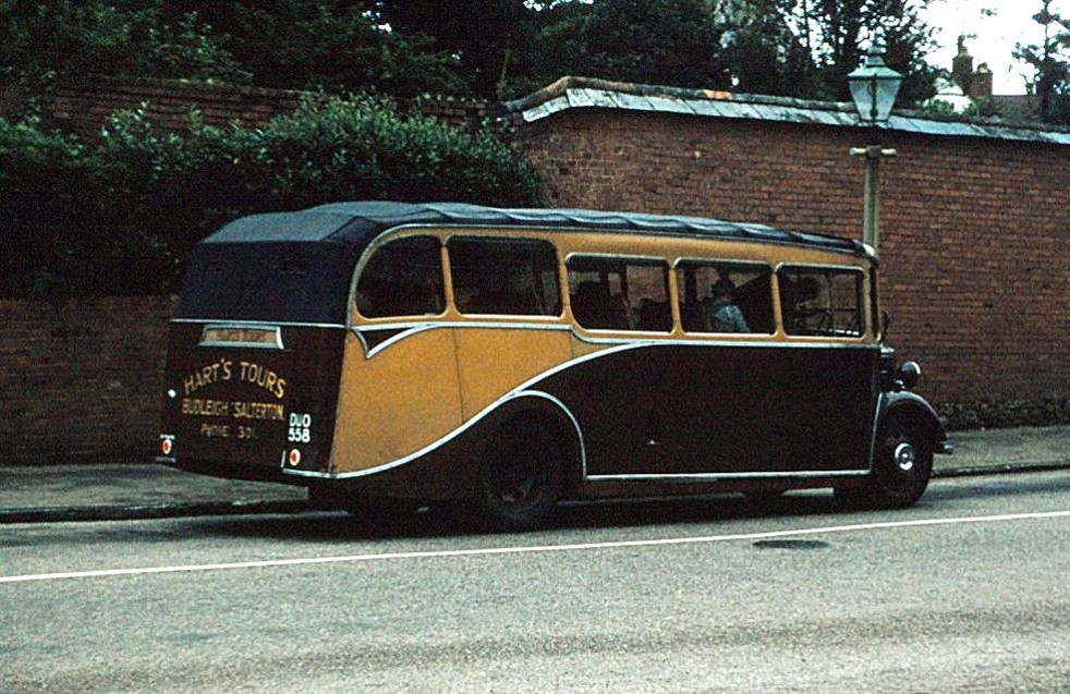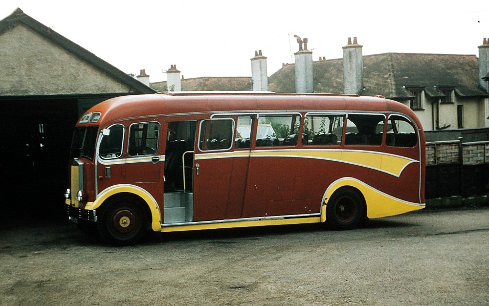 The town of Budleigh Salterton in Devon had been the base for Hart’s Bus Service & Hart’s Tours since 1927. In 1958 it was near the end of its existence as Mr. Hart had died several years previously and the business was continued by Mrs. Hart. I understand that she sold out to Devon General in 1959. But in 1958, it was still a fascinating little operation. Most of the stage carriage work had been lost except for a town circular, and they also operated a number of day and afternoon tours. The town circular was operated usually by a 1946 Duple-bodied Bedford OWB (image 165), down-seated to carry 20, the maximum for OMO at that time, although occasionally a gem of a vehicle, a 1936 Tiverton bodied Bedford WTB (image 162), worked the route. The WTB still had to its original floor, seats and roof; that canvas roof meant that no emergency exit was necessary. I apologise for the quality of this picture but I have included it because of its historic interest.